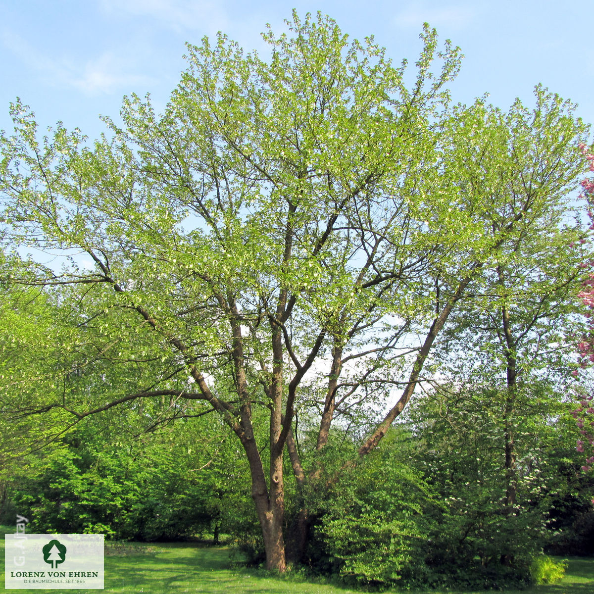 Malerischer Blütenbaum, klein bis mittelgroß, 6-10 (15) m hoch, 4-6 (8) m breit; breit-eiförmig, im Alter unregelmäßige Krone mit weitausgreifenden, waagerechten Ästen, wenig verzweigt; langsamwüchsig, Jahrestrieb 20-30 cm