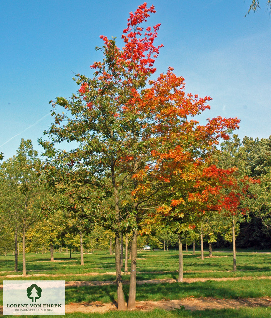 Quercus palustris (Sumpf-Eiche) mit ihren waagerechten Ästen und der kegelförmigen Krone ist eine weitgehend eher unbekannte Schönheit. Anders als ihr Name vermuten lässt, kann sie auf sauren bis schwach alkalischen Standorten ohne nasse Füße gedeihen, ja sogar in mäßig trockenen Böden. Sumpf-Eichen bevorzugen Plätze in der Sonne, akzeptieren aber auch lichten Schatten. Ihr tief eingeschnittenes Laub überrascht im Frühjahr mit einem glänzend grünen Austrieb und im Herbst mit einer intensiven, weithin leuchtenden orangegelben bis bronzeroten Herbstfärbung.